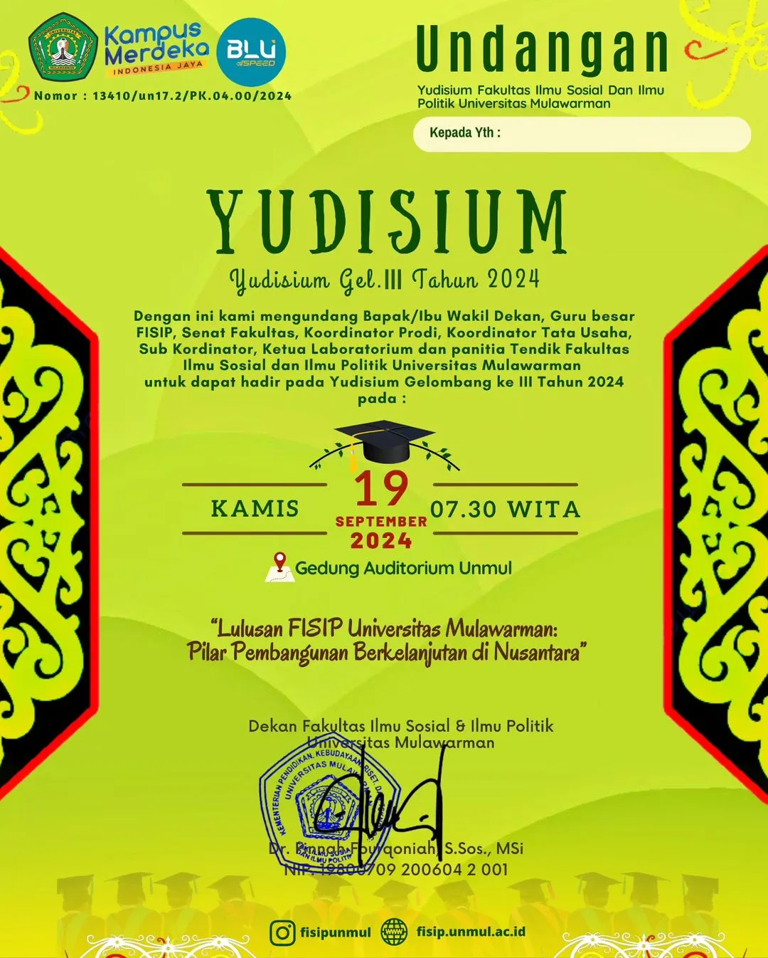 Untuk sahabat FISIP yang menjadi peserta Yudisium Gelombang III, jangan lupa untuk menyimpan momen berharga ini, ya! Acara yudisium adalah tanda resmi kelulusan sebelum wisuda, sehingga wajib diikuti oleh seluruh mahasiswa yang telah menyelesaikan seluruh syarat akademik.